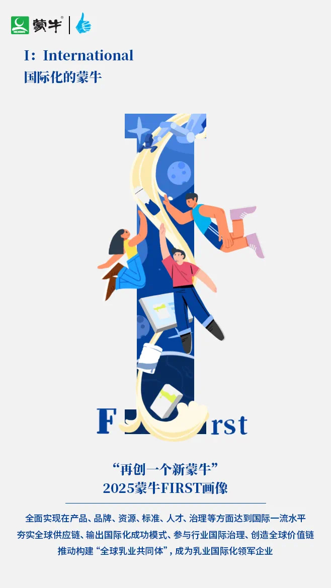 全面实现在产品、品牌、资源、标准、人才、治理等方面达到国际一流水平。夯实全球供应链、输出国际化成功模式、参与行业国际治理、创造全球价值链,推动构建“全球乳业共同体”,成为乳业国际化领军企业。